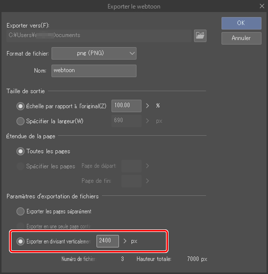 Ces paramètres peuvent être modifiés dans le menu [Fichier] > [Exporter le webtoon].