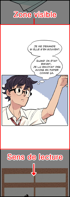 Dans une bande dessinée de style webtoon, les cases sont disposées de façon principalement verticale, avec plus d’espace entre elles, pour s’adapter à la plus petite taille d’affichage. Le défilement facilite également leur lecture.