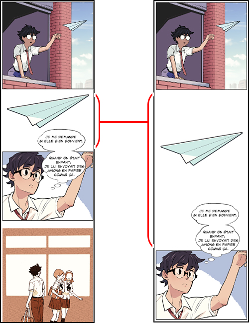 Dans les bandes dessinées et les mangas traditionnels, la forme des cases et la position des personnages et des dialogues sont organisées en fonction de la taille de la page. Les bandes dessinées de style webtoon, d’un autre côté, utilisent un long format de page et agencent ces éléments avec plus d’espace entre eux.