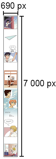 Bien que les fichiers webtoon soient affichés dans un format de défilement vertical long, chaque fichier à publier ne peut avoir qu’une hauteur maximale de 1280 px. Les fichiers seront ensuite affichés les uns après les autres.
