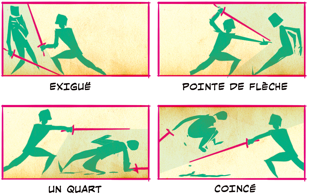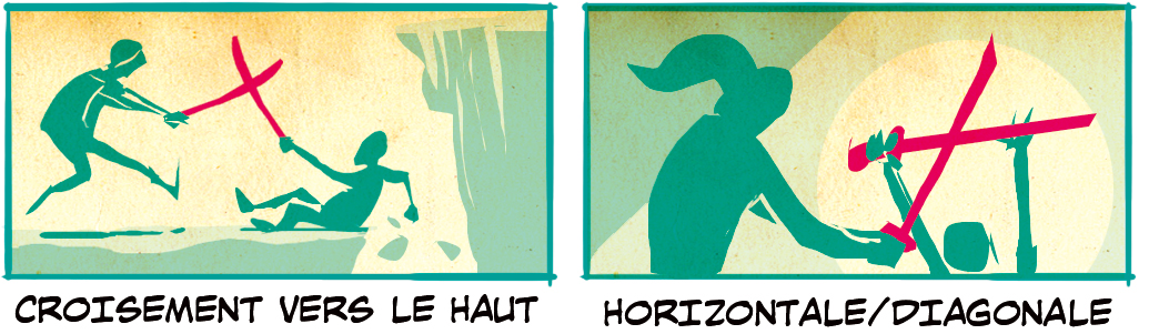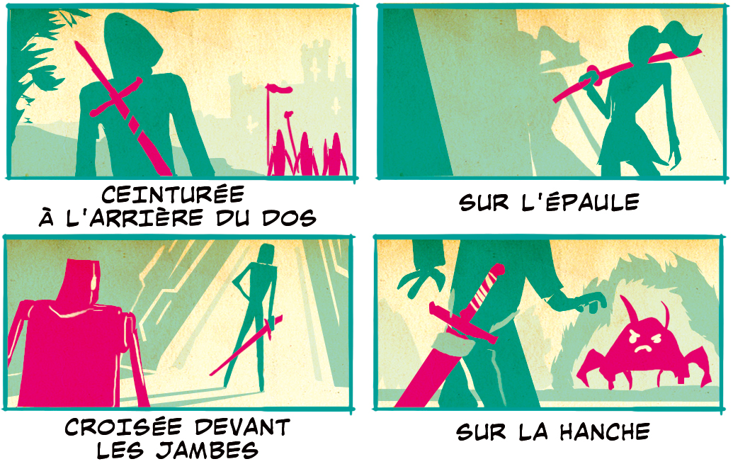 Des cases montrant une épée Ceinturée à l’arrière du dos rappellent que malgré le manque d’action immédiate, le personnage est armé et prêt à se battre à tout moment. Notez que l’épée pointe également dans la direction des personnages au loin, indiquant une éventuelle connexion à venir. Une épée Sur l’épaule marque une action plus offensive, mais donne un air décontracté. Ce personnage fait probablement partie des alliés. L’épée Croisée devant les jambes pousse cette impression un peu plus loin. Il pourrait s’agir d’alliés temporaires. L’épée est en position passive, mais prête, si nécessaire. Épée Sur la hanche est la case montrant le plus d’agressivité. Elle montre une épée et une main en suspens prête à dégainer et un visuel clair de sa cible. Le message ici est clair. L’épée rencontre le monstre.