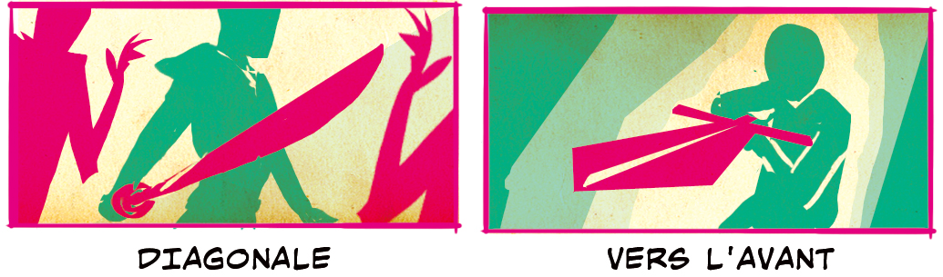 Le raccourcissement de l’épée permet des angles dynamiques dans lesquels l’épée entière et une bonne partie du visage et du corps du personnage sont visibles. Les vues Vers l’avant & Par l’arrière ont toutes les deux un fort impact visuel. Nous pouvons voir le visage des personnages avec l’épée, ce qui est convenable ! Ces types d’angles permettent au lecteur de plonger au cœur de la bataille et de la vivre avec intensité.
