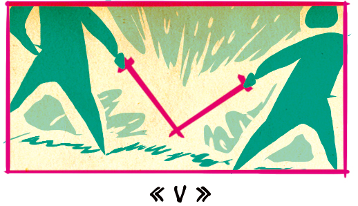 Les épées en angle droit offrent de nombreux avantages des autres compositions, comme guider l’œil du lecteur autour de la scène d’un personnage à l’autre tout en offrant une autre option de composition de scène de combat différente des autres scènes. Le V est une forme de croisement d’épée comme présenté ci-dessus, mais l’accent est mis sur les pointes des lames plutôt que sur les personnages eux-mêmes.