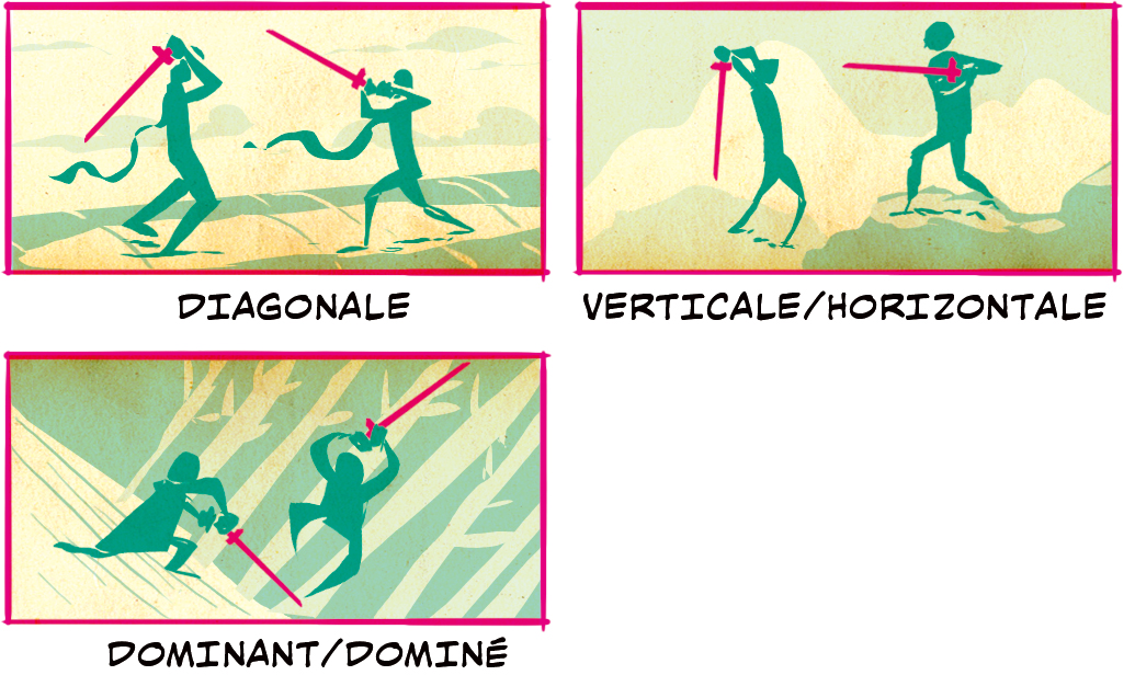 Les autres options comme Diagonale et Verticale/Horizontale, sont de bonnes options pour montrer la tension juste avant un coup dur. La position Dominant/Dominé est une bonne occasion de montrer une inclinaison de la caméra et un personnage esquivant habilement un coup porté.