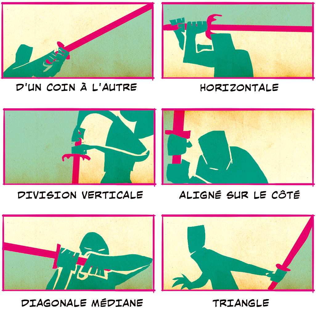 Ces options conviennent pour briser les images du champ de bataille et se concentrer directement sur le personnage. Il est important que l’épée touche le bord du panneau pour un dynamisme maximal. C’est aussi un bon moyen de connecter visuellement des cases avec une ligne solide. Les vues D’un coin à l’autre et Horizontale sont les meilleures pour les images horizontales et la Division verticale et Aligné sur le côté sont les meilleures pour les images verticales. Pour les clichés spectaculaires, rien ne vaut une Diagonale médiane où la ligne de l’épée attire vos yeux directement dans l’œil du personnage ou un Triangle où le personnage plonge dans un combat ou termine un coup d’épée.