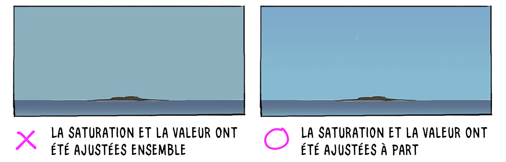 Remplissez le ciel d’une demi-teinte bleue. Ajoutez deux dégradés. Un plus sombre en haut, un plus clair en bas. N’oubliez pas de changer la teinte ! Voici mon tutoriel précédent qui vous guide sur les jeux de couleurs pour comprendre l’importance du changement de teinte entre les couleurs.