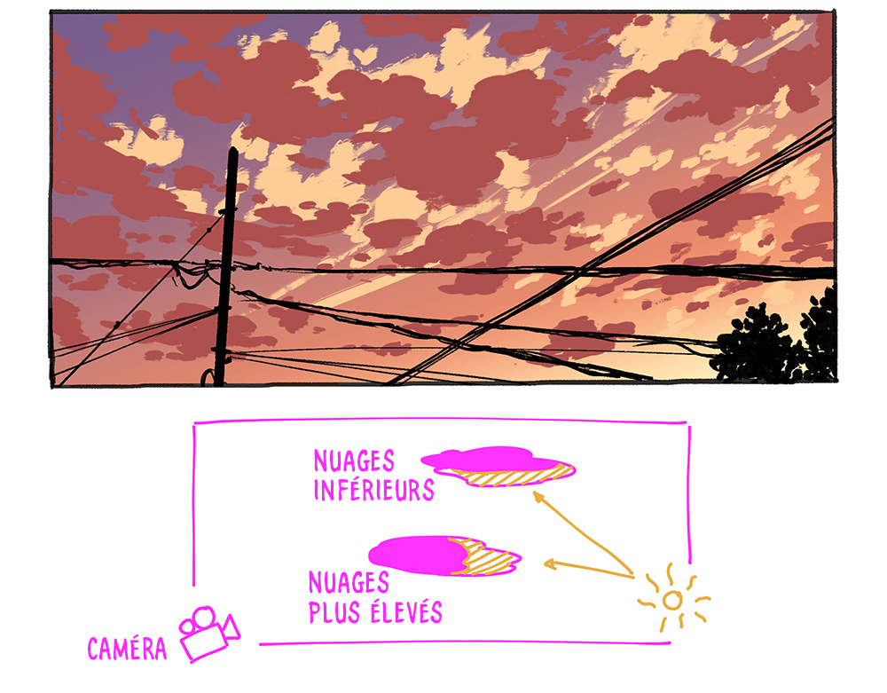 Inutile de trop donner de rendu aux nuages supérieurs, car ils sont éloignés. Un peu de dégradé suffira.