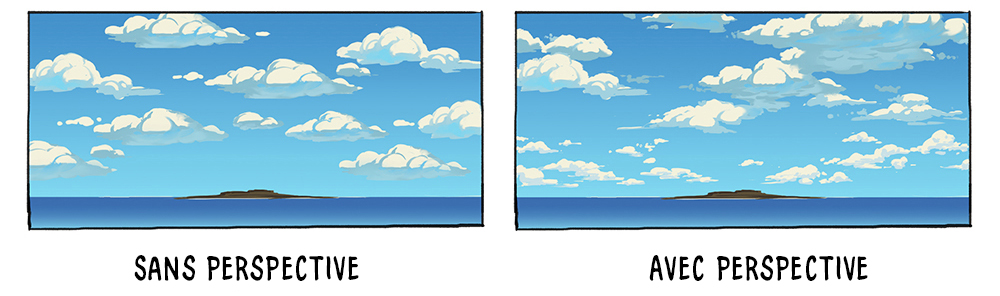 Faites attention à la perspective lorsque vous dessinez des nuages dans le ciel. Les nuages sont répartis dans le ciel. Sans perspective appliquée, le ciel aura l’air plat et manquera de profondeur.