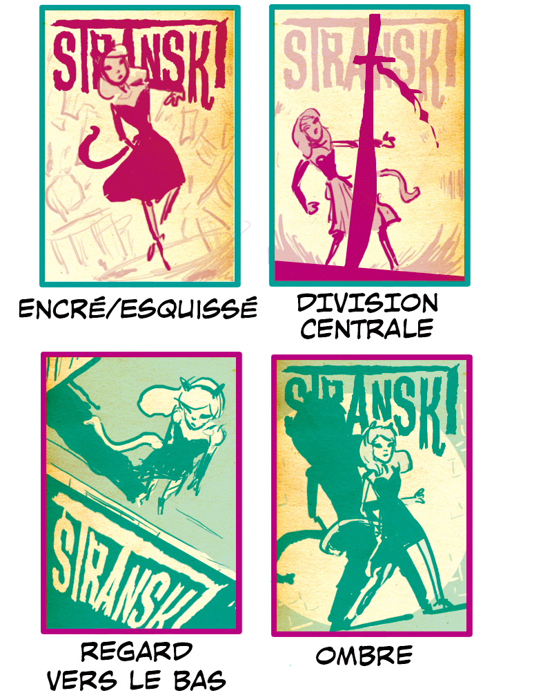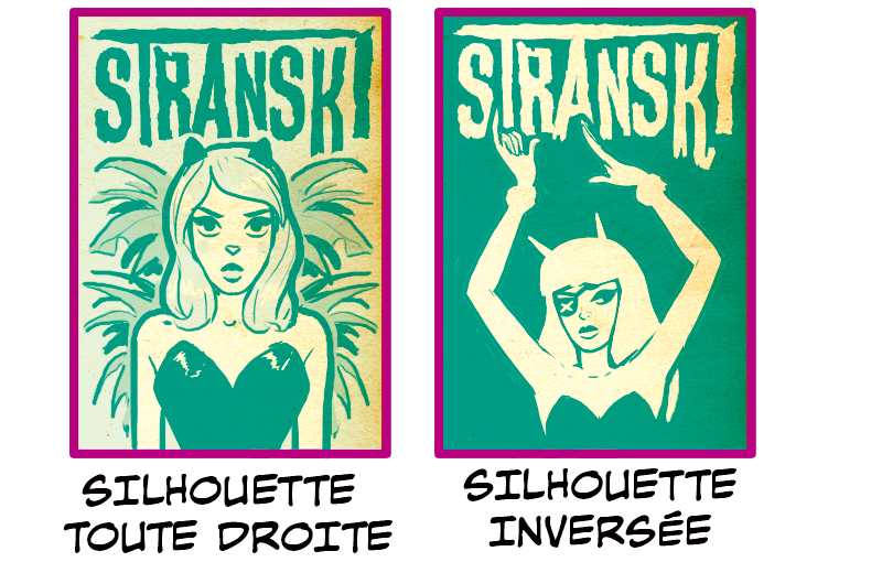 La Silouhette droite et inversée sont des compositions similaires dans la façon dont le personnage est placé : un corps vu de moitié tourné vers l’avant. La Silouhette droite comporte un élément de fond qui se déploie derrière la forme. C’est très percutant, car les émotions du personnage semblent éclater à la face du lecteur. La Silouhette inversée a également un impact visuel élevé, mais au lieu de provenir du personnage ou des éléments d’arrière-plan, il provient du fond à contraste élevé qui pousse le regard vers le personnage au centre.