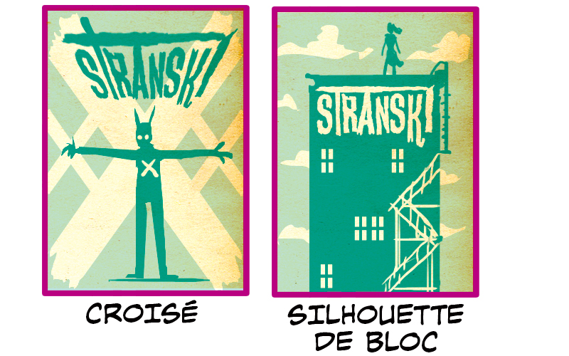 Les effets Croisé et Silhouette de bloc sont des exemples de compositions de silhouette simplifiées. L’effet Croisé a un élément abstrait (une croix) qui fait écho à la fois à l’arrière-plan de la couverture et à la pose de la figure centrale. C’est un symbole assez vague qui peut être appliqué à de nombreux éléments d’une histoire, en particulier lorsqu’un personnage est à la croisée des chemins. Notez que le logo est également étiré pour s’adapter aux angles de l’élément transversal. La Silhouette de bloc montre une composition à laquelle de nombreux créateurs de couvertures de bandes dessinées ne sont pas étrangers, la silhouette sombre au sommet d’un bâtiment. Encore une fois, notez comment le logo est intégré dans la conception de la couverture et aide à équilibrer et à compléter la composition globale.