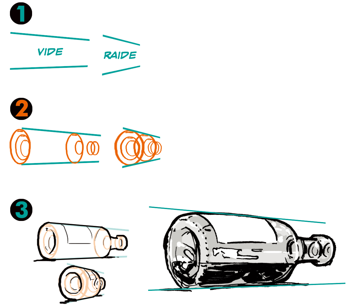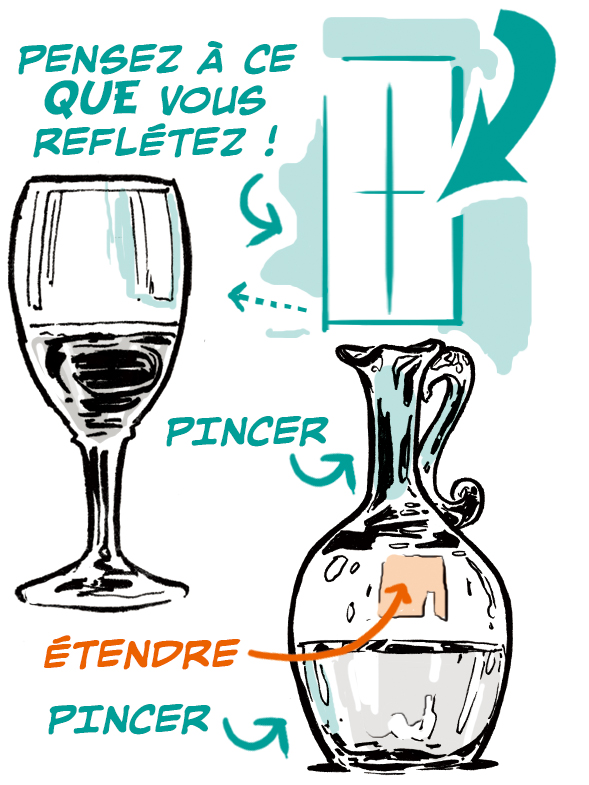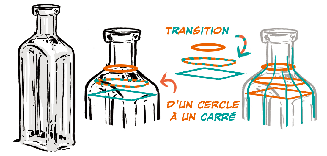 Dessiner des bouteilles est un exercice qui consiste à équilibrer la forme des lignes et les détails de réflexion de la lumière, ainsi que la translucidité du matériau.