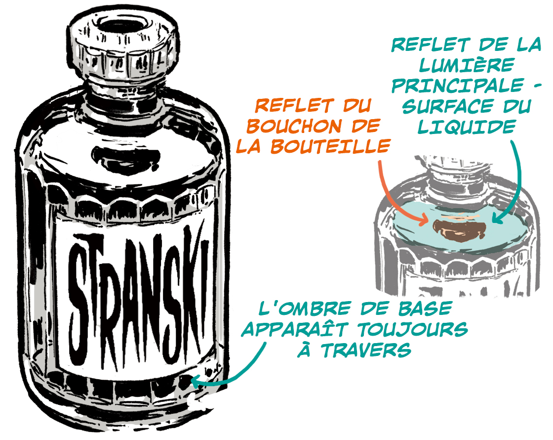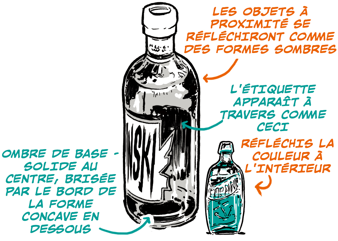 Lorsque vous dessinez des bouteilles remplies de boissons de couleurs foncées, pensez aux reflets du liquide.