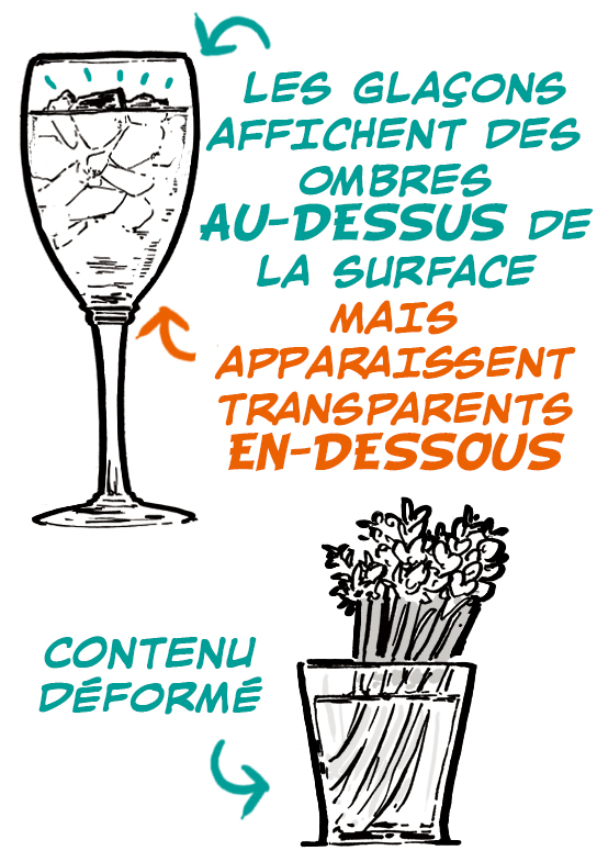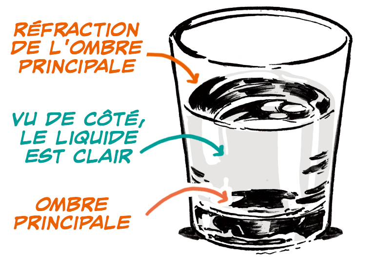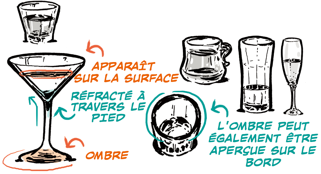 Pour les verres remplis de liquide clair, l’ombre de la base est réfractée vers la surface, lorsqu’on les observe sous un angle différent.
