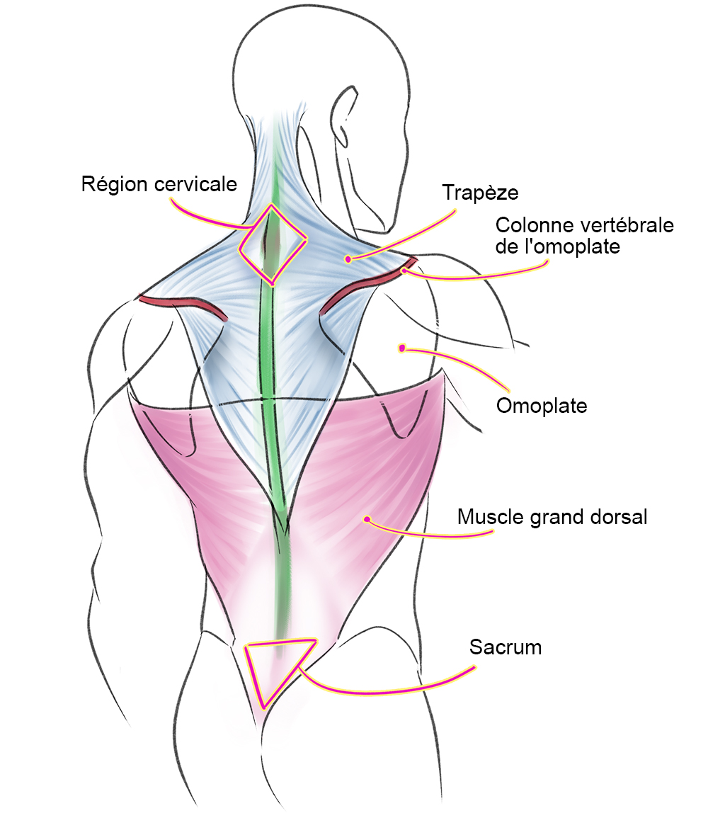 Dans le dos est situé le muscle trapèze. C’est le muscle qui s’étend sur la partie supérieure du tronc et qui aide à déplacer l’omoplate.