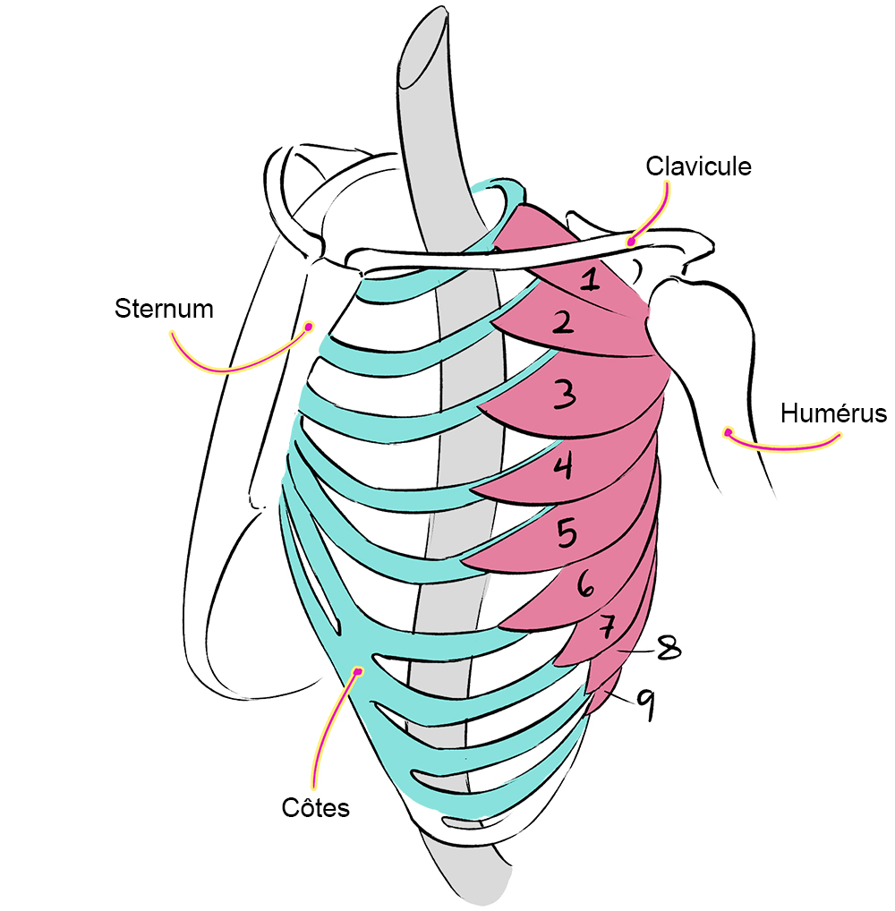 Le dentelé antérieur est tiré des neuf côtes supérieures dans l’omoplate, assurant stabilité et mobilité à l’os. Ce muscle a la forme d’un éventail, mais on ne peut en voir qu’une partie car il est recouvert par les pectoraux, les obliques et les dorsaux.