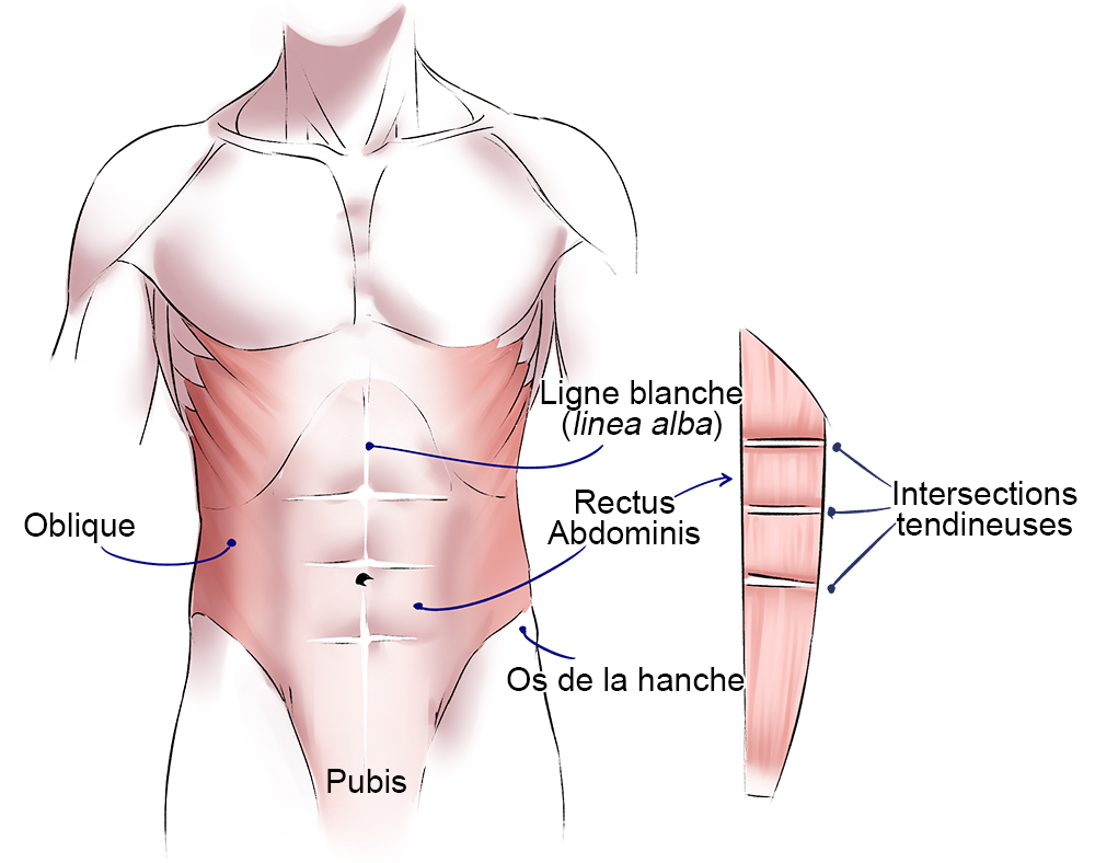 Au centre, on trouve le muscle droit de l’abdomen, sous l’arche des côtes jusqu’au pubis. Il a 3 intersections qui séparent le muscle en 4 zones de chaque côté.