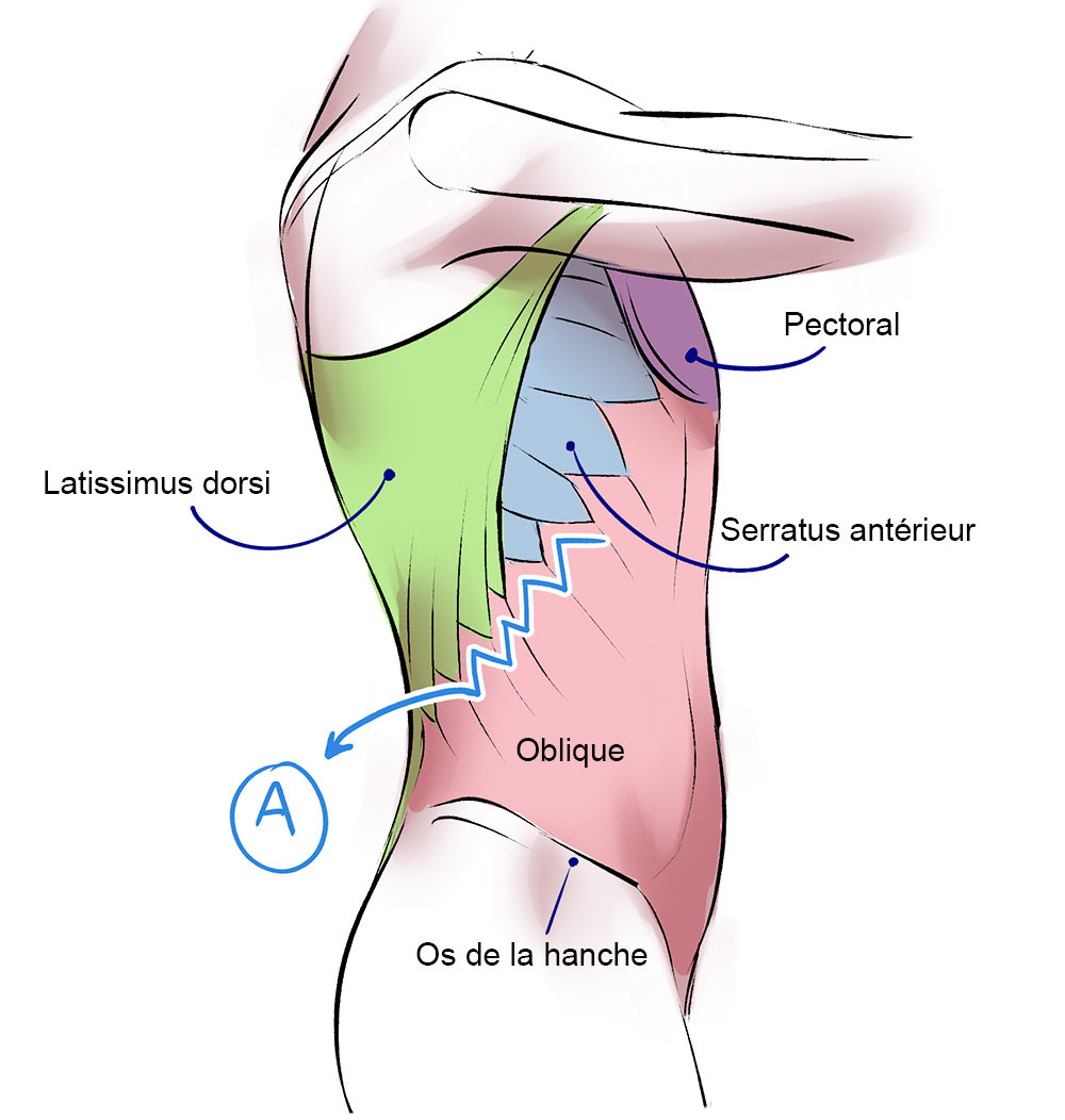 Cette vue de côté montre comment les muscles (dorsaux, obliques et serratus antérieur) s’entrelacent créant une ligne en zigzag (A).