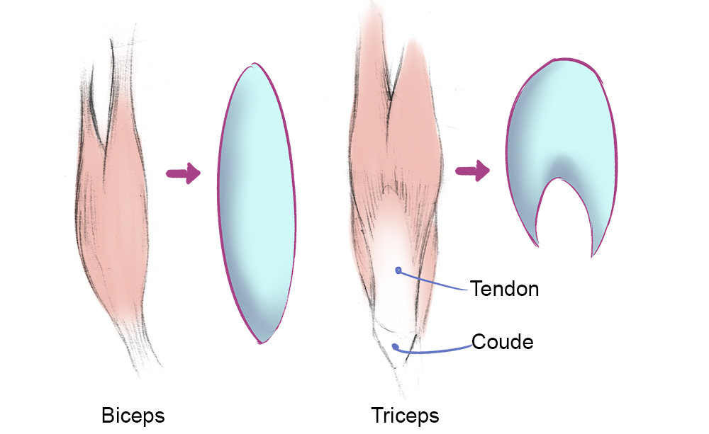 Pour simplifier les biceps , dessinez un ovale étiré. Vous pouvez considérer la partie la plus épaisse du triceps comme une forme de fer à cheval …, ou un croissant ! La partie plate du triceps (le tendon) est reliée au coude.