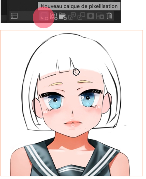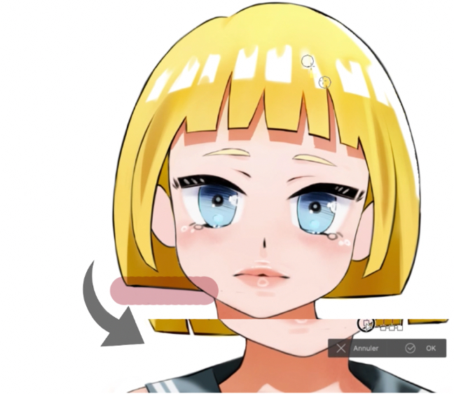 J’accentue l’éclaircissement avec des petits carrés blancs que l’on voit souvent dans les mangas et j’efface quelques zones du bas pour rendre les cheveux moins massifs.