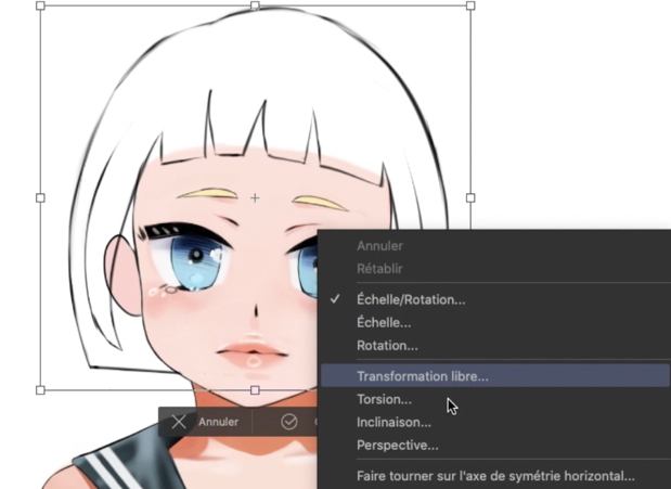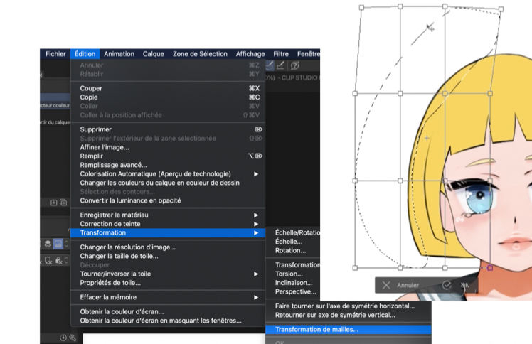 Ici, je remarque que la forme du croquis ne me convient toujours pas. Pour changer ça, je réutilise le « lasso », je fais un copier-coller de la zone que je veux modifier et avec l’outil de « transformation de mailles » je déforme la zone pour obtenir le résultat voulu. Après je gomme les endroits inutiles avant de fusionner avec le calque du dessin principal qui contient le visage.
