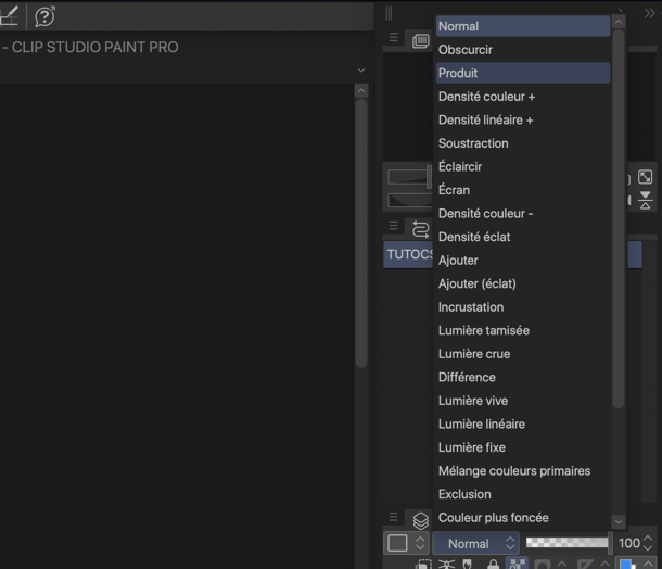 Je commence par l’ombre. Je crée un nouveau calque que je passe en mode « produit » dans la liste déroulante des différents calques qui se trouve juste à votre droite, et je peins la zone que je veux assombrir. C’est le meilleur calque pour assombrir un dessin car en peignant, on ne vas pas cacher le dessin juste en dessous comme avec un calque normal, puisque le calque produit superpose les couleurs toute en les assombrissant.