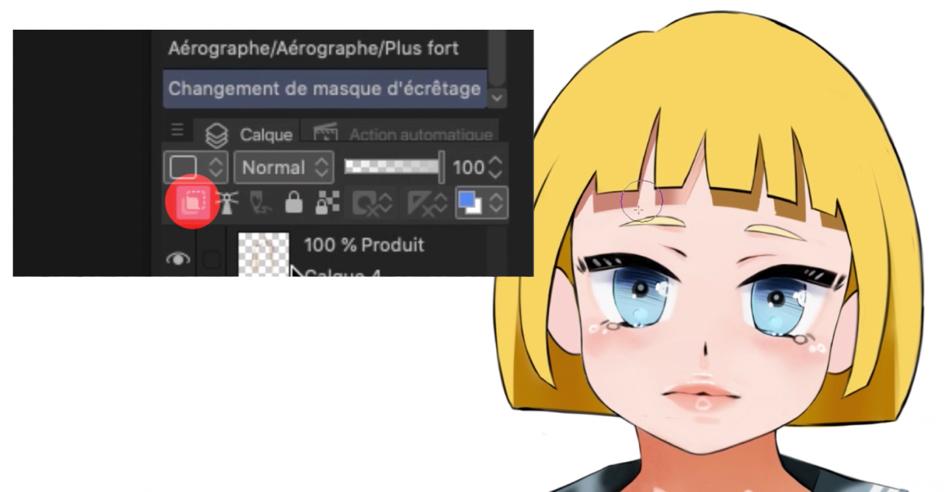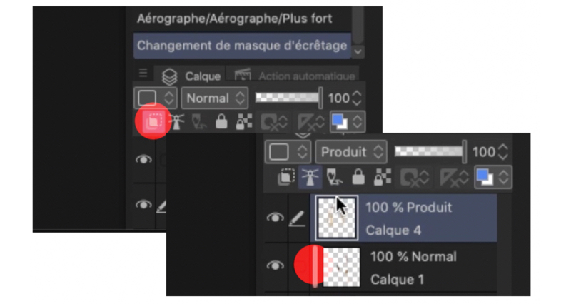Puisque je dessine sur un autre calque, et que je ne veux pas déborder sur le dessin d’en bas, je crée, ce qui s’appelle, un « masque d’écrêtage sur le calque inférieur »en cliquant sur l’icône et je m’assure que le petit voyant rouge s’allume indiquant si le calque est bien en écrêtage.