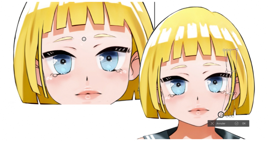 A ce stade, je trouve que les cheveux sont trop simplistes et je pense qu’ajouter plus de mèche permettra de rendre les cheveux plus intéressants à regarder. J’en dessine une. Pour gagner du temps je fais un copier-coller de la mèche que je viens de dessiner et je fais une « symétrie horizontale » pour la placer à droite du dessin. Je fais une transformation de mailles pour casser la symétrie et avoir un ensemble plus dynamique.