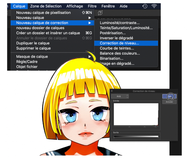 Si vous avez l’impression que vos couleurs sont ternes, alors vous aller dans [calque]> [nouveau calque de correction] et vous choisissez l’option « correction de niveau ». Ensuite, avec le curseur de la fenêtre qui vient de s’afficher, vous saturez les couleurs au maximum.