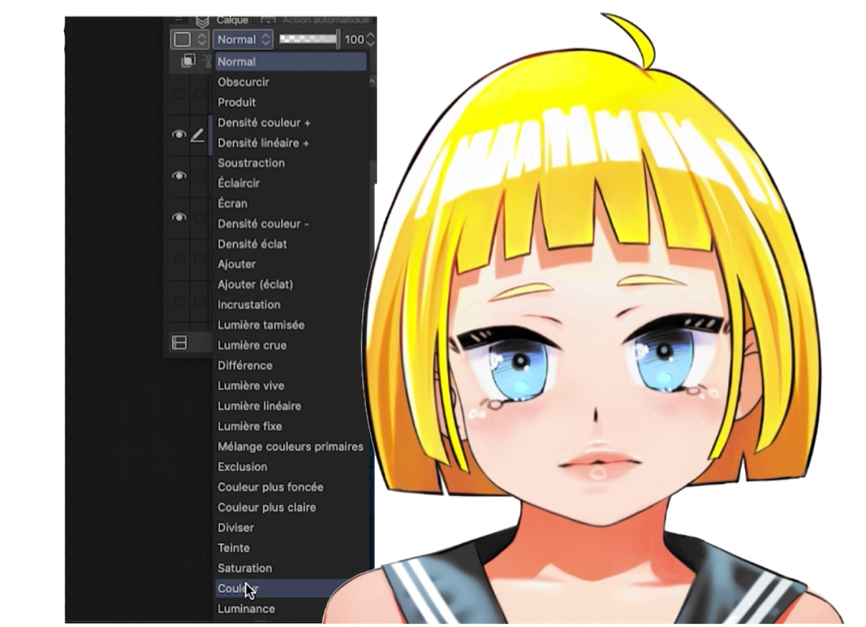 Puis vous transformez le calque en mode « couleur », vous baissez l’opacité pour que le dessin soit moins saturé pour ainsi obtenir des couleurs moins ternes.