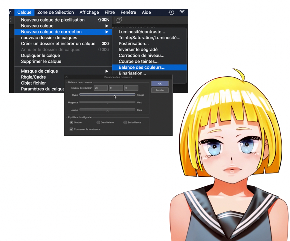 La deuxième astuce est avec « balance des couleurs », qui se trouve dans [calque] > [calques de correction] > [balance des couleurs] et qui permet de varier les tons bleu, jaune et rouge grâce aux curseurs de la fenêtres. Et je fais varier les nuances avant de trouver une combinaison satisfaisante.
