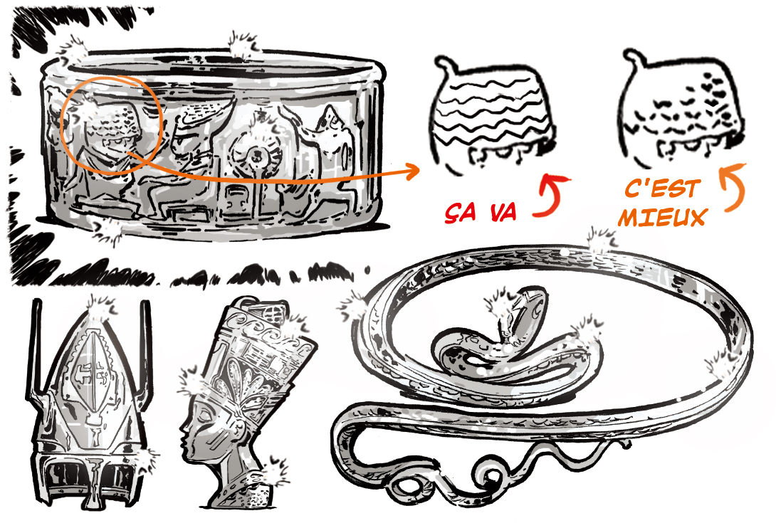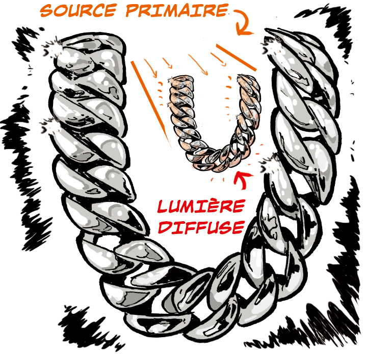 La lumière ne se reflète pas dans la même quantité sur chaque partie des objets en or – souvenez-vous de votre source de lumière et utilisez-la pour vous guider où vous regroupez les reflets.