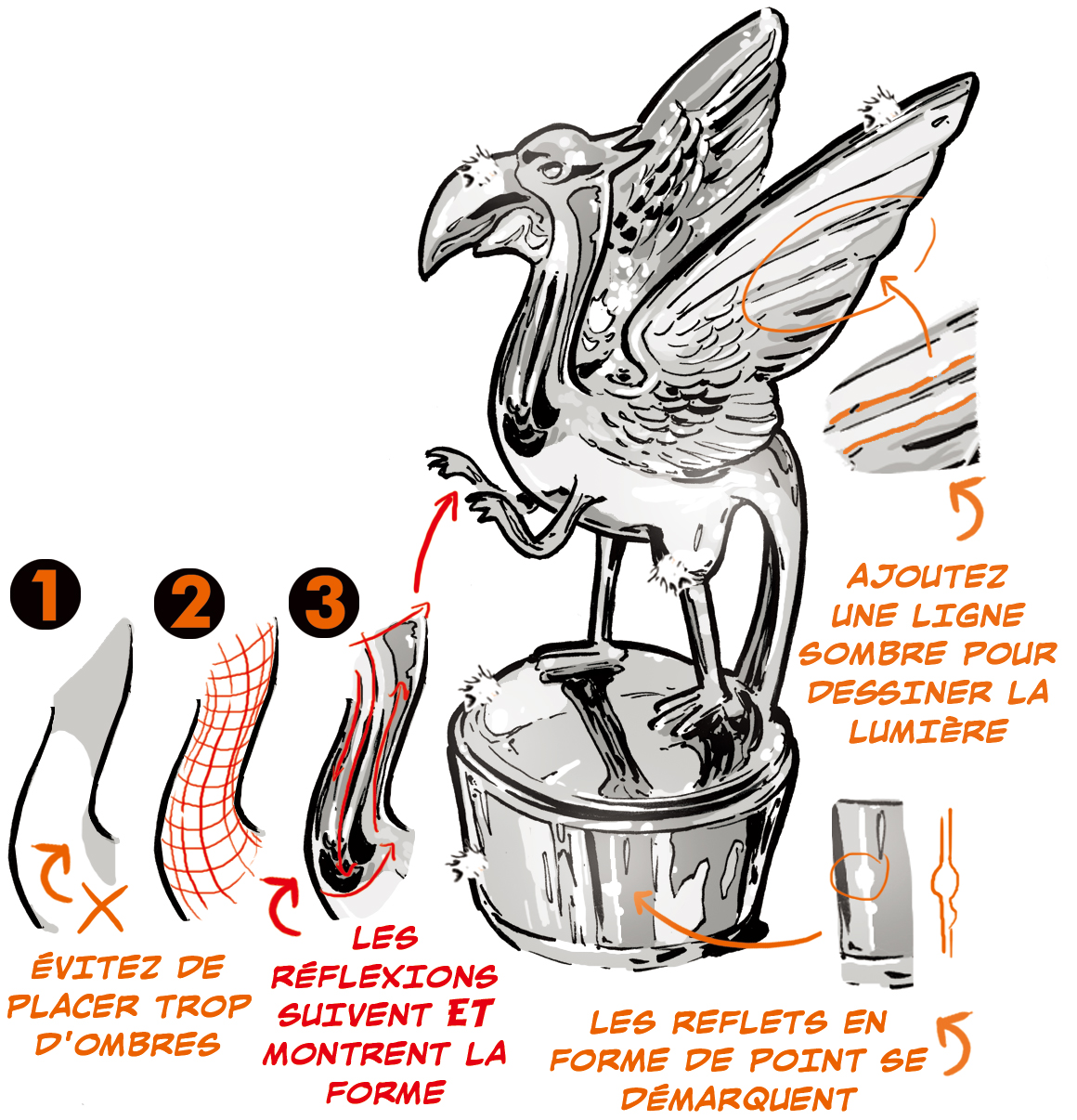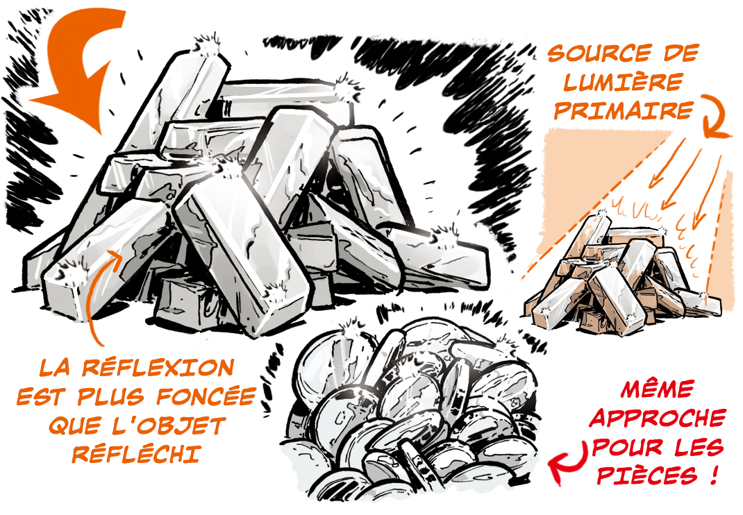 Si vous décidez de dessiner un tas de lingots, simplifiez les reflets, mais n’oubliez pas de refléter les ombres sombres.