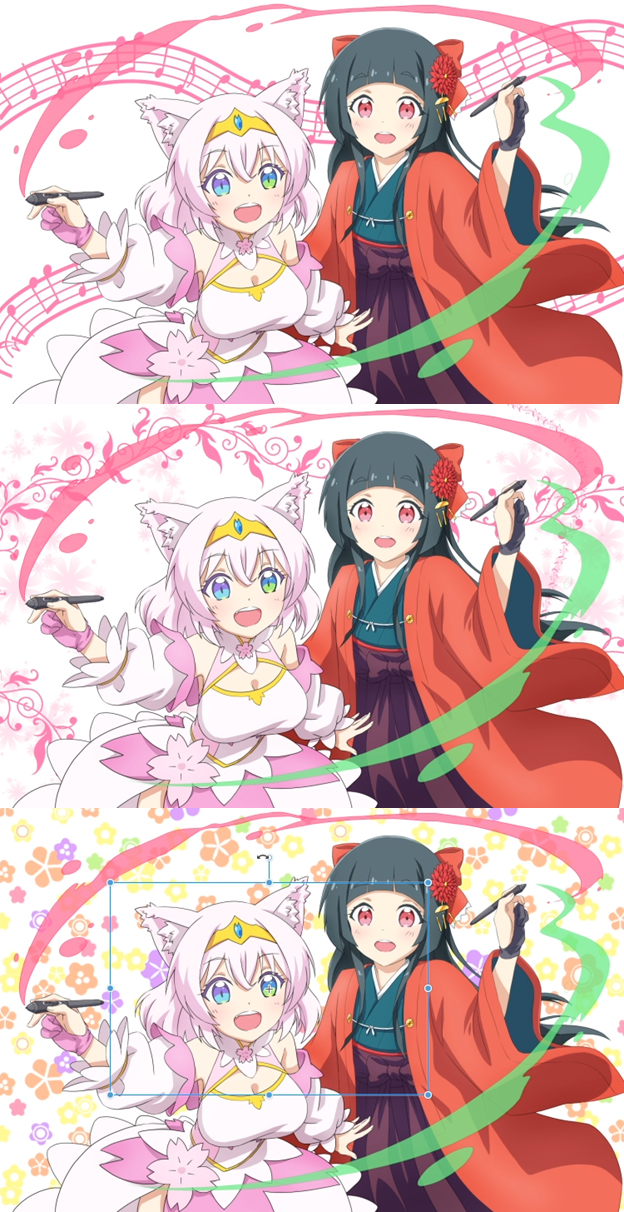 En plus de l’arrière-plan, j’ajoute également d’autres détails au premier plan de l’image, comme des étincelles, des pétales ou des motifs.