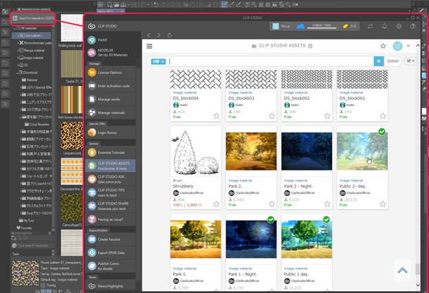 Certains matériaux sont disponibles dans la palette Matériau de CLIP STUDIO PAINT. Vous pouvez également télécharger plus de matériaux depuis CLIP STUDIO ASSETS.