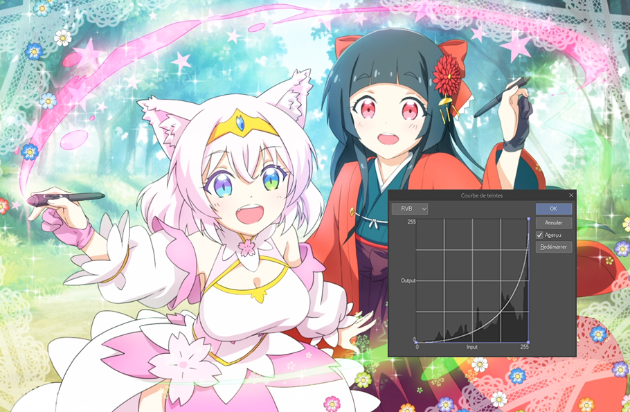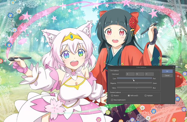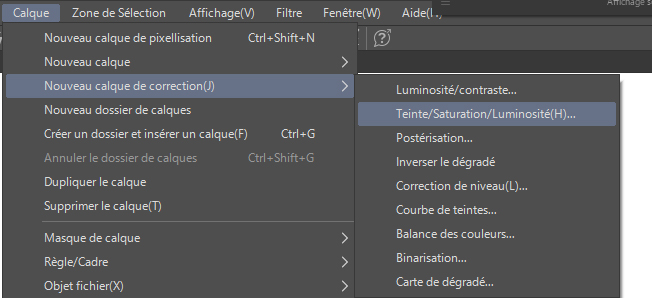 Les options couramment utilisées sont Courbe de teintes, Balance des couleurs, Teinte / Luminosité / Saturation, etc. Cette fois, je vais ajuster un peu les personnages pour qu’ils ne contrastent pas trop avec l’arrière-plan.