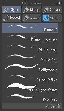 Dans CLIP STUDIO PAINT, les outils sont organisés par type. Pour chaque outil, plusieurs outils secondaires sont installés par défaut. Les outils de dessin sont tous rangés dans la même catégorie dans la palette d’outils secondaire.