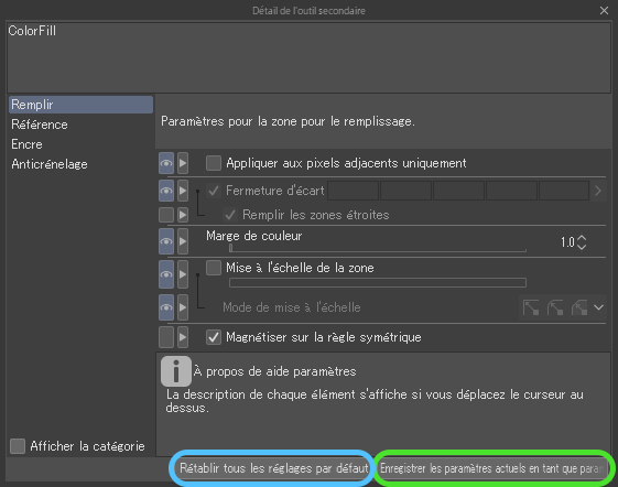 Pour enregistrer les modifications que vous avez apportées aux paramètres de l’outil, cliquez sur Enregistrer les paramètres actuels en tant que paramètres par défaut pour cet outil secondaire dans la boîte de dialogue Détail de l’outil secondaire. Après l’enregistrement, si vous modifiez accidentellement le paramètre, vous pouvez facilement revenir en arrière en cliquant sur Rétablir tous les réglages par défaut.