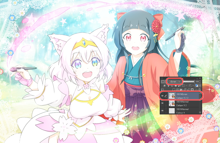 Je vais partager un dernier secret avec vous pour égayer l’atmosphère de votre illustration. Si vous créez un nouveau calque au-dessus de tous vos autres calques et changez le mode de combinaison sur Écran, puis utilisez l’aérographe pour ajouter une couleur claire tout autour de la toile, cela rendra l’image lumineuse et brillante comme s’il y avait de la lumière qui brille dans les airs !