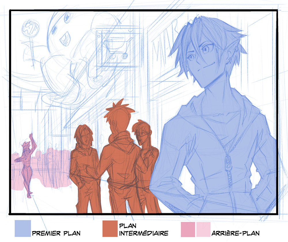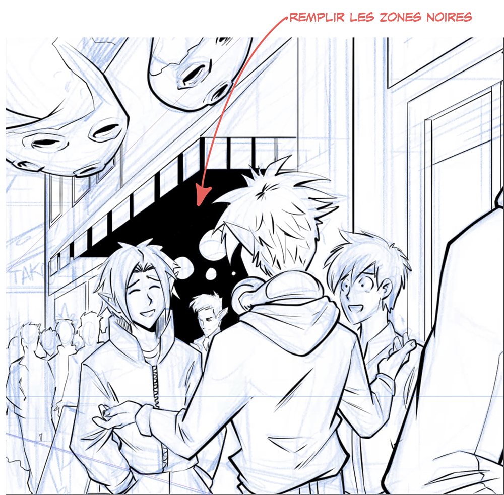 Une fois que vous avez terminé d’encrer le premier plan, vous pouvez commencer à encrer le second plan. Ce que vous devez garder à l’esprit maintenant, c’est comment rendre les lignes du second plan plus minces que celle à l’avant-plan. Cela donne l’illusion de profondeur et une perspective atmosphérique. Séparation de l’avant-plan, du plan intermédiaire et de l’arrière-plan Le lecteur pourra distinguer que le personnage le plus proche est dans un plan différent de celui du groupe de personnes derrière lui.