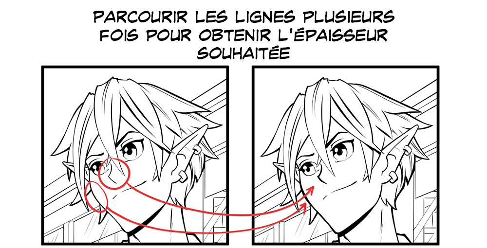 Regardez votre illustration et ajustez les épaisseurs de vos lignes en conséquence. Souvent, je me surprends à oublier certains morceaux et à ne pas epaissir certaines lignes. Par exemple, pour le personnage principal de ce plan, au premier plan, j’ai épaissi les lignes pour le faire ressortir un peu plus, et vraiment le faire se détacher.