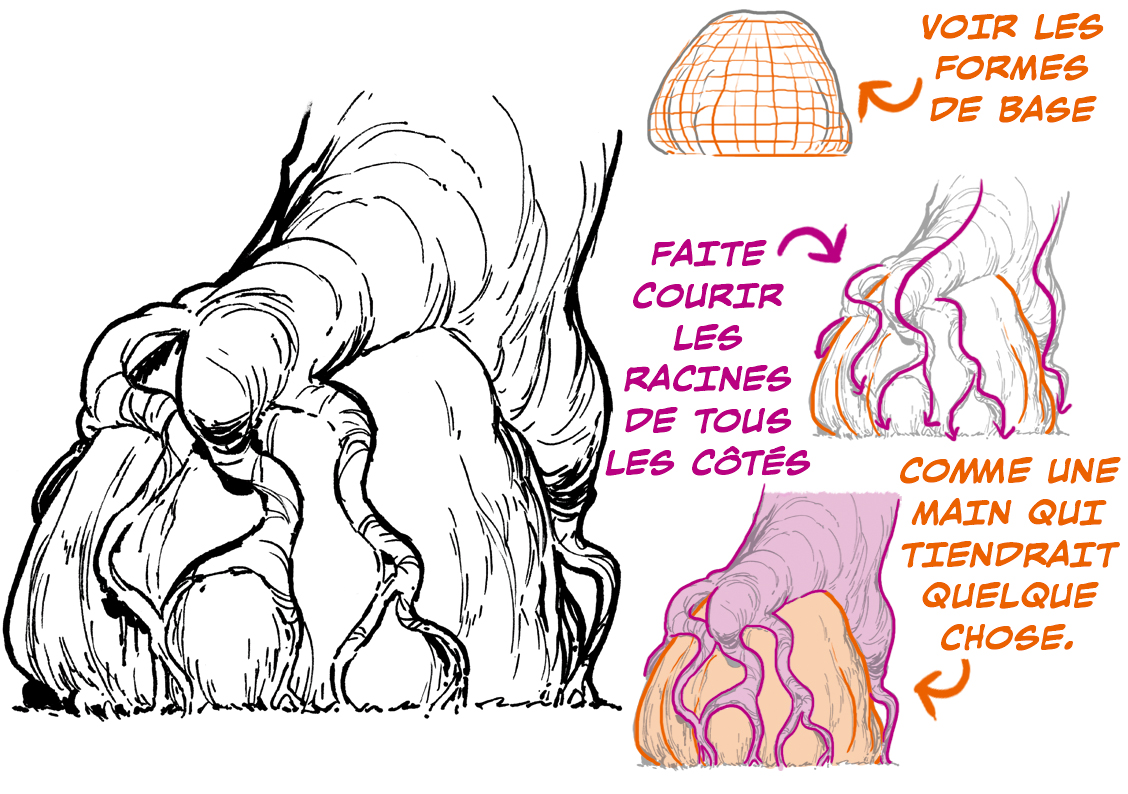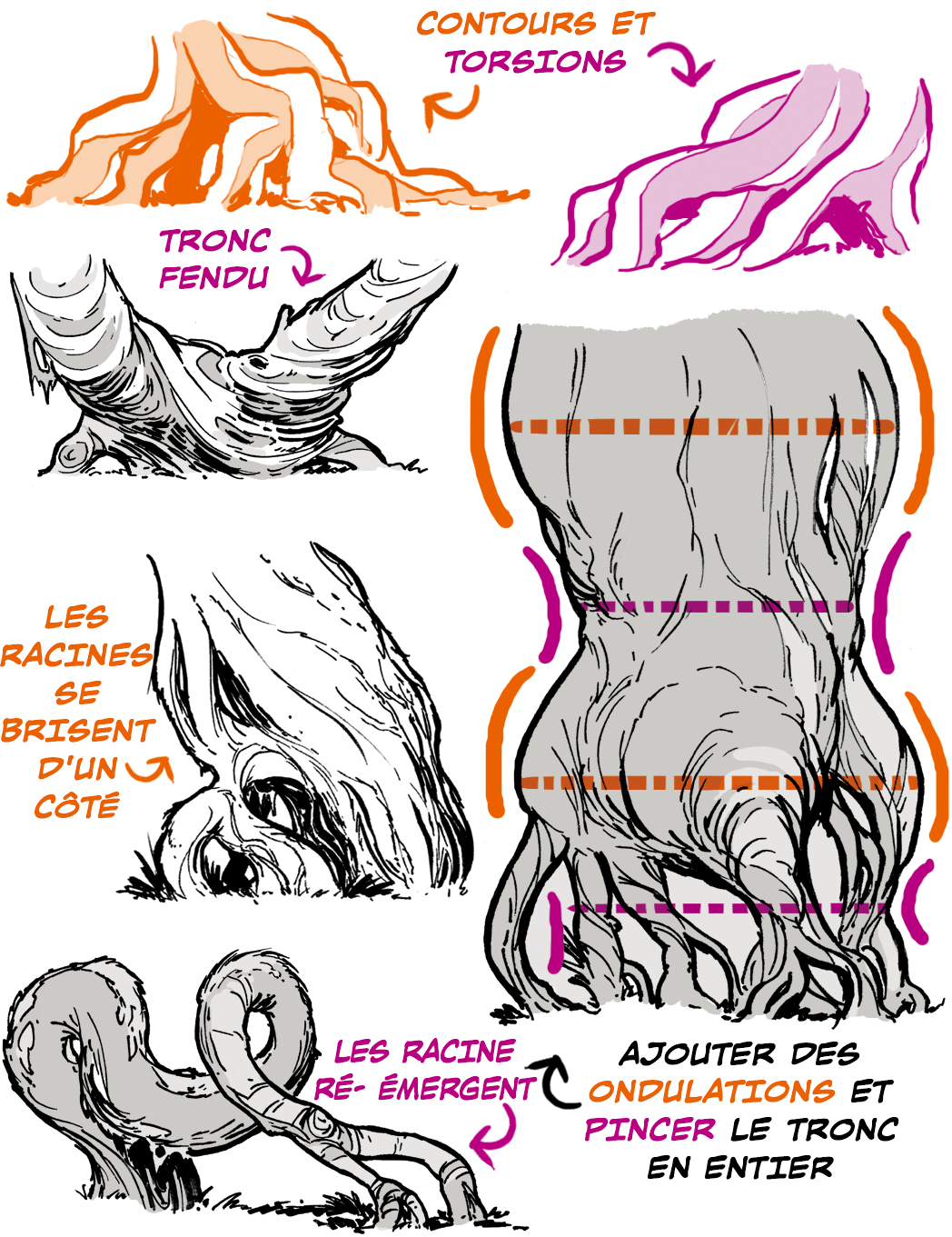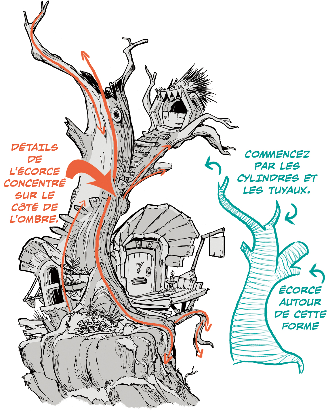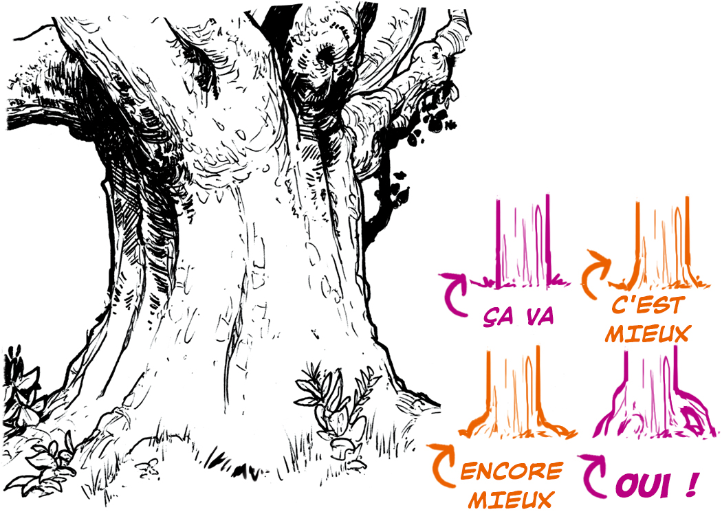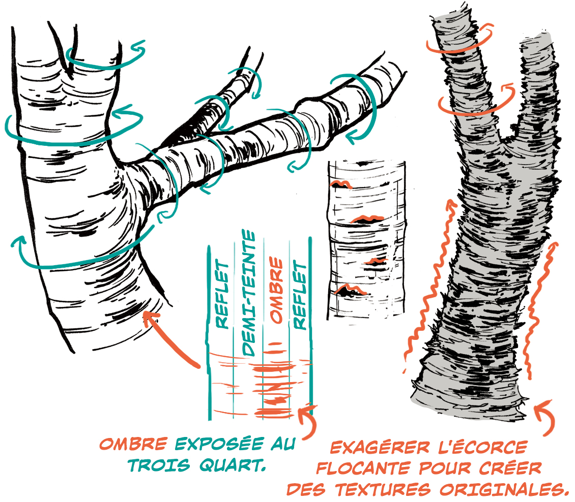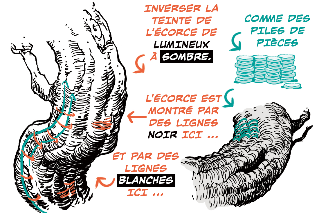 Si l’arbre a beaucoup de noeuds, utilisez la concentration du motif de l’écorce pour décrire les formes.