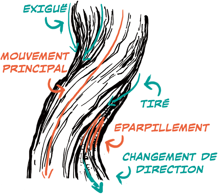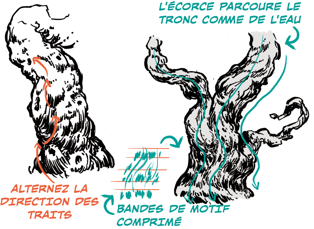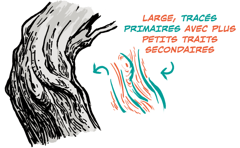 Un motif d’écorce vertical, bien exécuté peut être dessiné comme s’il s’agissait d’un grain de bois.