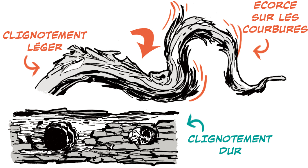 Une torsion dans le tronc casse l’écorce en zones d’intérêt.