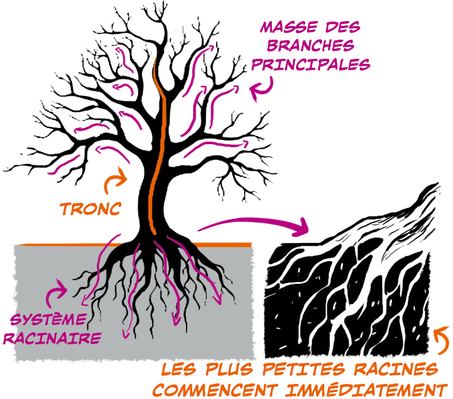 Le système racinaire reflète les branches de l’arbre, mais avec un ensemble plus compact de « branches » racinaires plus grandes.