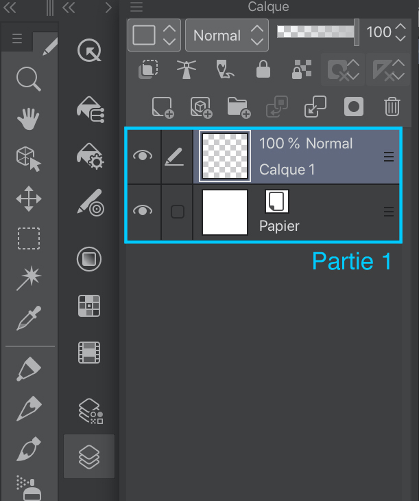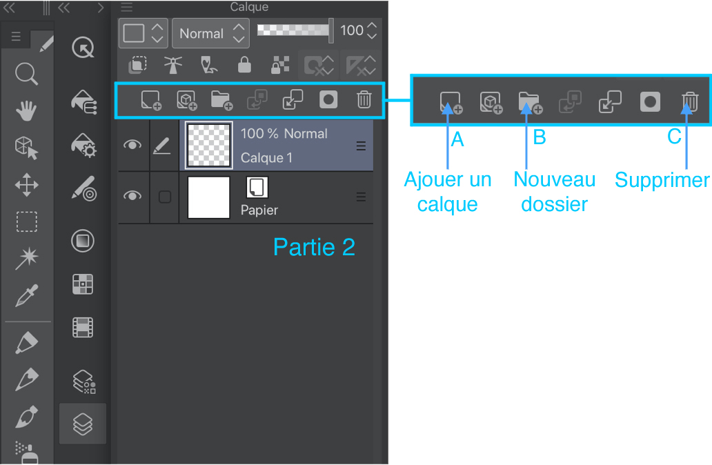 La gestion de base des calques se fait avec la partie n°2 (options ajouter, dossier, supprimer etc.). Pour le moment, les seules options qui nous intéressent sont celles qui vont nous permettre de créer un nouveau calque, créer un dossier de plusieurs calques et enfin supprimer un calque.