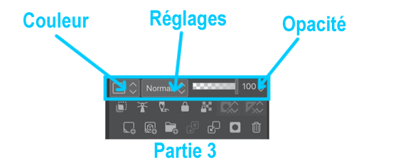 La partie n°3 permet de changer la couleur du calque (attention, il s’agit de changer la couleur à des fins d’organisation dans la liste des calques et non dans l’illustration), changer les réglages du calque et pour finir son opacité.