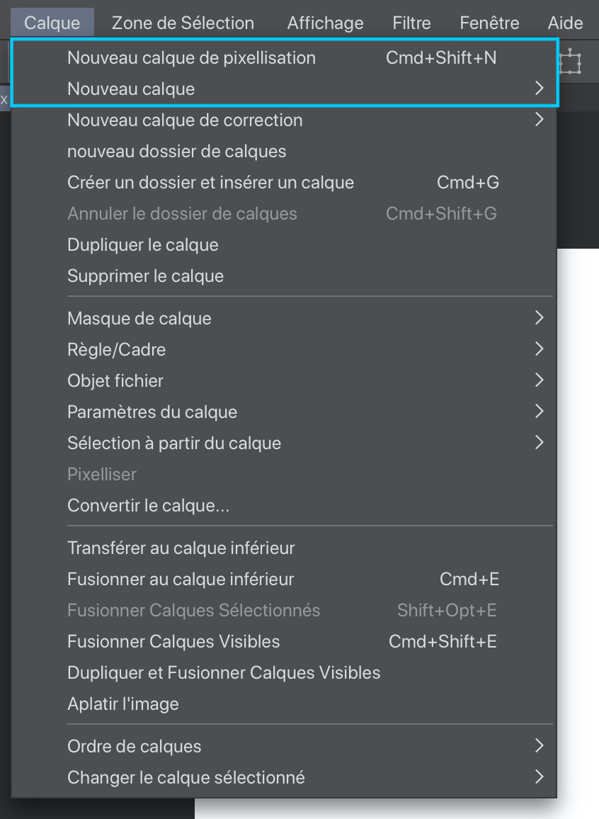 Pour créer un nouveau calque, trois options sont possibles. Soit on appuie sur le bouton dans le menu des calques, soit on utilise le menu déroulant en haut en sélectionnant Calque > Nouveau calque de pixellisation, soit on souhaite créer un type de calque différent comme un calque de trame par exemple et dans ce cas, il faut sélectionner dans le menu déroulant Calque > Nouveau Calque > Trame…