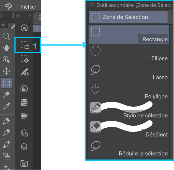 Lorsqu’on appuie sur le 1, on peut accéder à d’autres outils de sélection. Par défaut, celui qui est sélectionné permet de dessiner des zones de sélection carrées ou rectangulaires. Il est également possible de tracer des zones en ellipse (Ellipse), de formes libres (Lasso), en forme de polygone (Polyligne) par une suite de segments. L’autre option (stylo de sélection) permet de sélectionner des zones en « coloriant » ce que l’on souhaite sélectionner. L’outil suivant (Désélect) permet quant à lui d’affiner la sélection en effaçant le « coloriage » de l’outil précédent. Enfin, le dernier outil (Réduire la sélection) permet de ne sélectionner que les pixels d’un même trait à l’intérieur de la zone tracée. Attention toutefois, ce dernier outil ne sélectionnera aucun pixel si vous n’incluez pas la totalité du trait ou de la zone auquel appartiennent ces pixels.