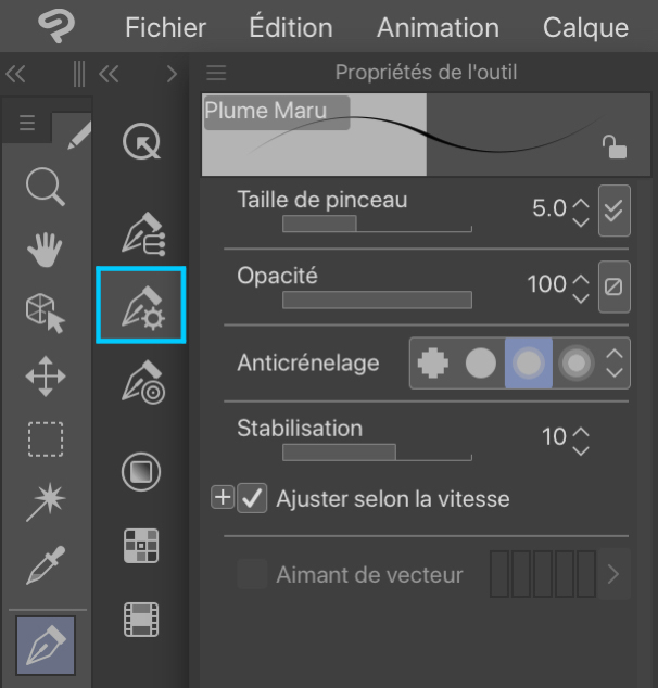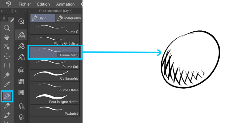 Emplacement de l’outil : Outil Stylo > Stylo > Plume Maru