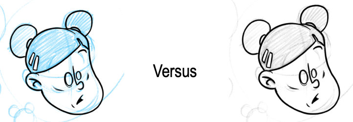 Pendant cette phase, je change la couleur par défaut de mon pinceau. Par un souci d’organisation, je dessine toujours en bleu lors des phases de croquis et de recherche. Ainsi, lorsque j’encre mon dessin, le bleu du crayon ne vient pas perturber mon regard : les traits noirs sont ceux du dessin final.